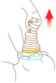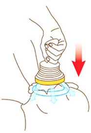 Simplesmente coloque a máscara sobre a boca e nariz da vítima. Pressione para baixo para criar sucção. A duração da sucção é mínima, o que torna o LifeVac seguro e eficaz. Depois, puxe de volta para cima e a obstrução sairá da garganta da vítima.